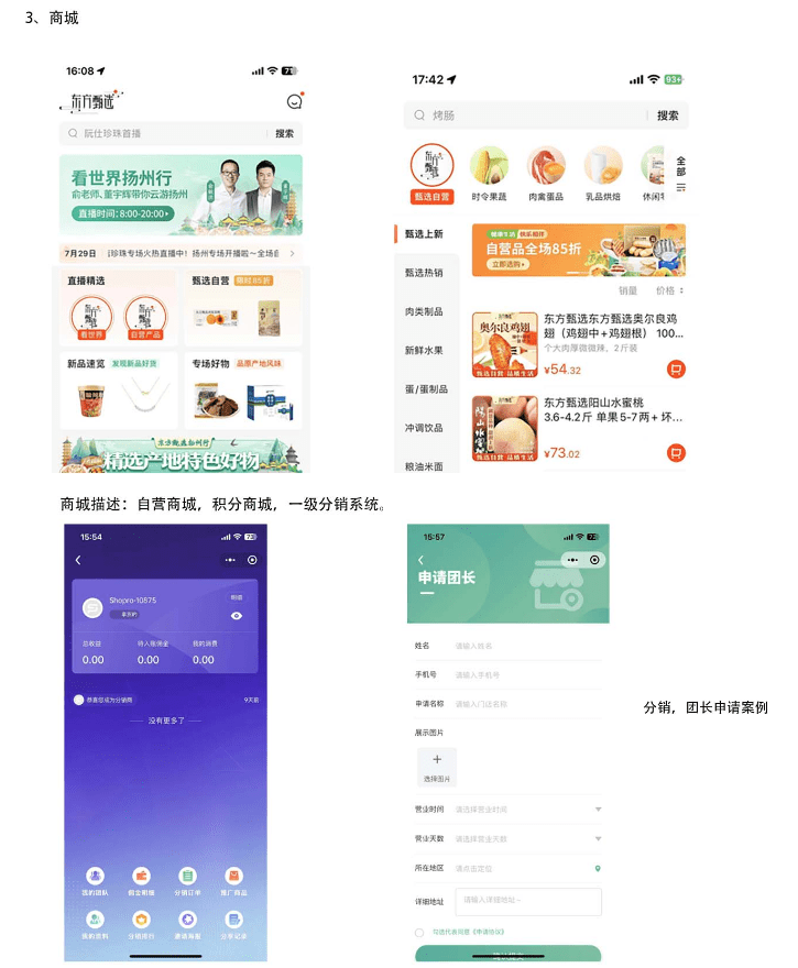 普通用户: 注册即为会员,会员分为LV0-LV9等级,相应等级通过购买物品金额累计升级。 (设定相应等级可以分享日常等,但无法使用健康端口)积分:积分通过签到,购买物品返积分获得。积分可用来进行小游戏,积分商城物品兑换,积分抵用现金形式团长:团长需申请,填写基本信息后提交通过后台审核进行。团长“发展下线”场景团长二维码:团长进入分销中心模块后,点击发展下线功能按钮,显示专属推广二维码,用户扫码后进入小程序系统自动识别若为新用户则自动绑定与该团长分销关系分享商品:团长可分享商品链接或商品海报至微信好友,好友通过链接进入小程序后,系统自动识别若为新用户则自动绑定团长分销关系