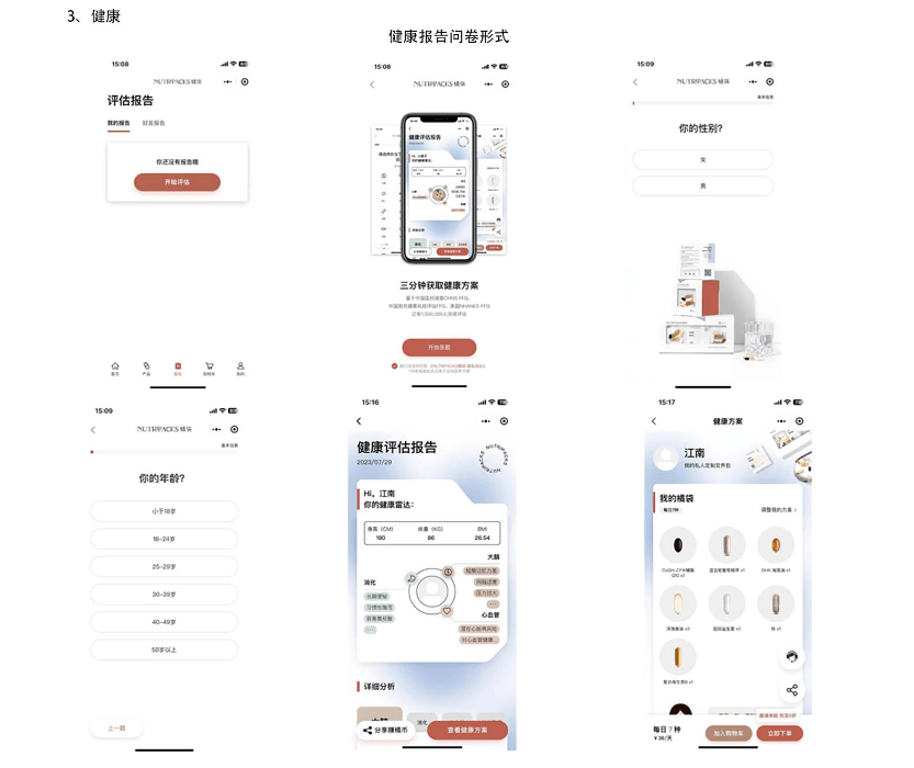 健康流程:评估一问卷答题一健康评估一健康方案(根据用户身体状况进行产品推荐方案)问卷内容会分为: