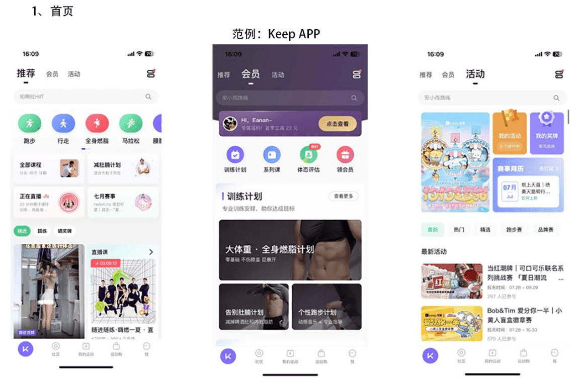 首页-推荐:推荐页面加载一些社区评论较高内容,活动页面报名内容,健康知识相关内容,全站系统内推荐