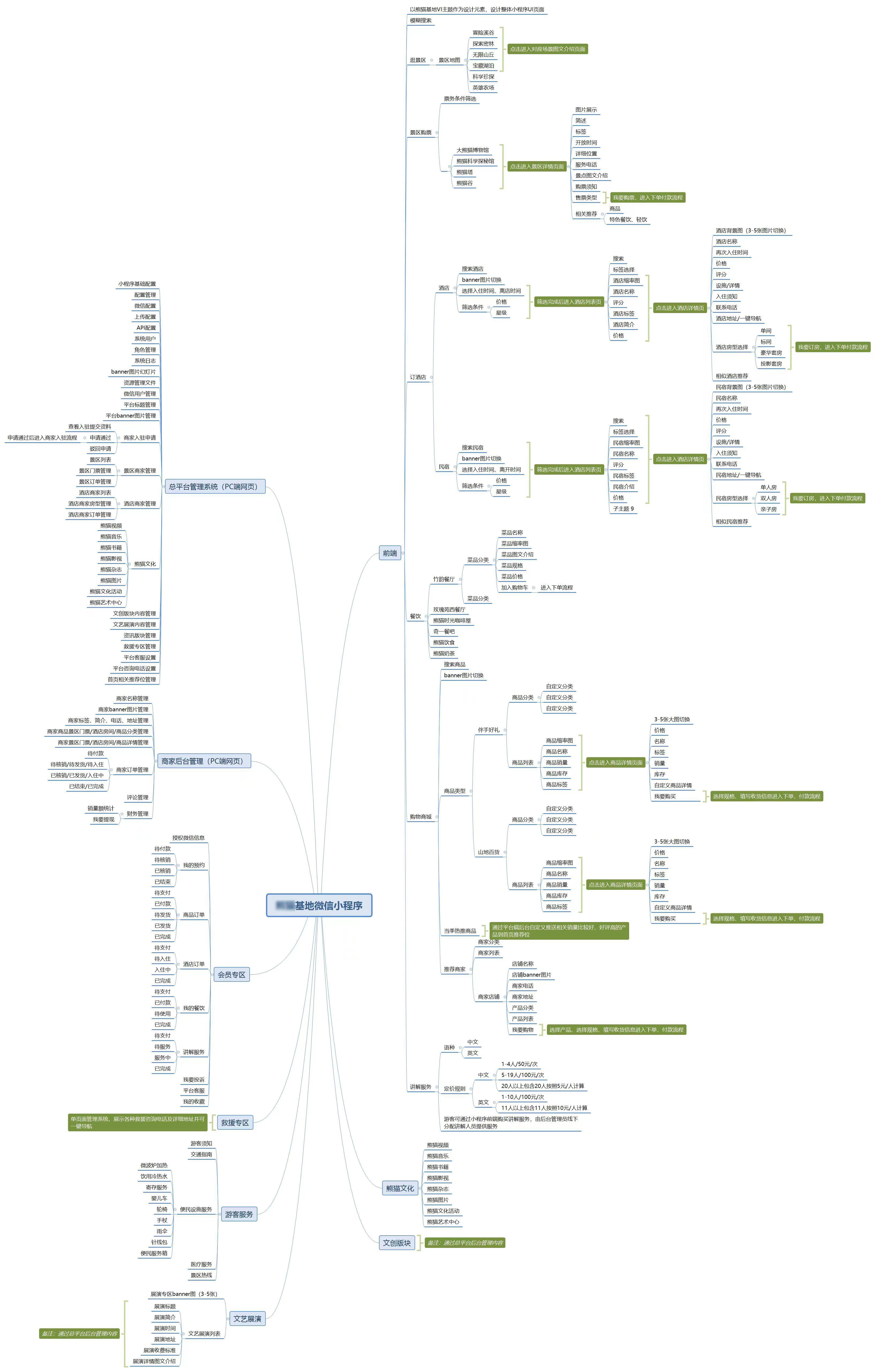 因为景区有商家入驻,所以后台的管理端分为了总后台管理端和商家后台端。我们在做需求图的时候,就像财务里面的会计分录一样,需要明白这个功能从哪里来,到哪里去。商家管理功能从入驻商家而来,到总管理后台去了。然后我们再来分析细节流程:商家入驻申请,总管理后台审核,审核通过之后商家发布信息,信息同步到总后台,总后台输出到用户端。整个流程就这样走通了。